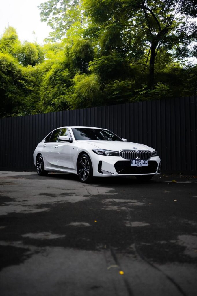 BMW 320i M Sport langsung menarik perhatian melalui desainnya yang dinamis. Bagian depan mobil menampilkan kidney grille khas BMW yang memberikan identitas kuat pada kendaraan ini.